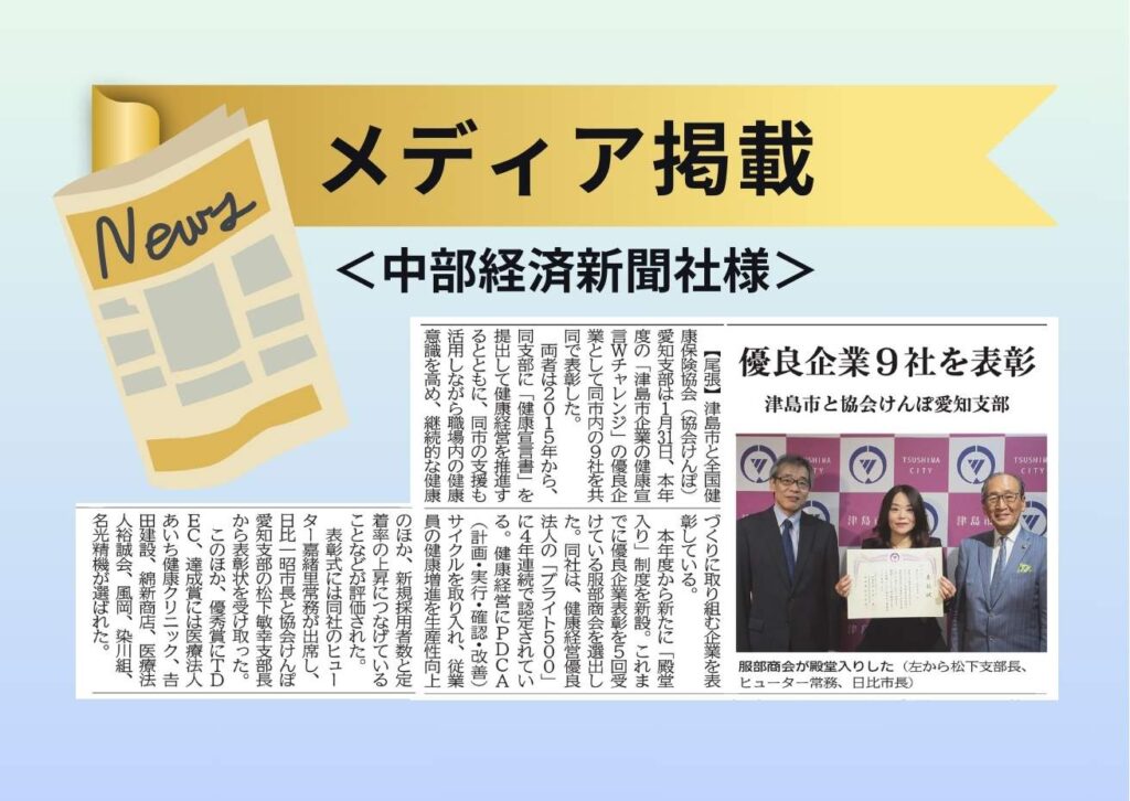 2月3日付けの中部経済新聞にて、「津島市企業の健康宣言Wチャレンジ」における弊社の表彰の様子が掲載されました。