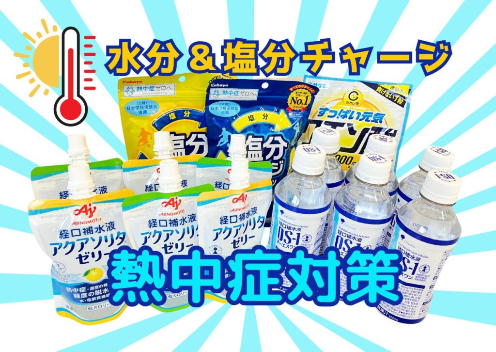 これらの製品は、発汗によって失われる水分や電解質(ナトリウム・カリウム)を効率的に補うことができ、熱中症の予防に効果的です。また、塩分チャージタブレットやクエン酸入りの飴は、手軽に塩分・ミネラル・クエン酸を摂取でき、熱中症対策だけでなく、夏バテ予防や疲労回復にも役立ちます。